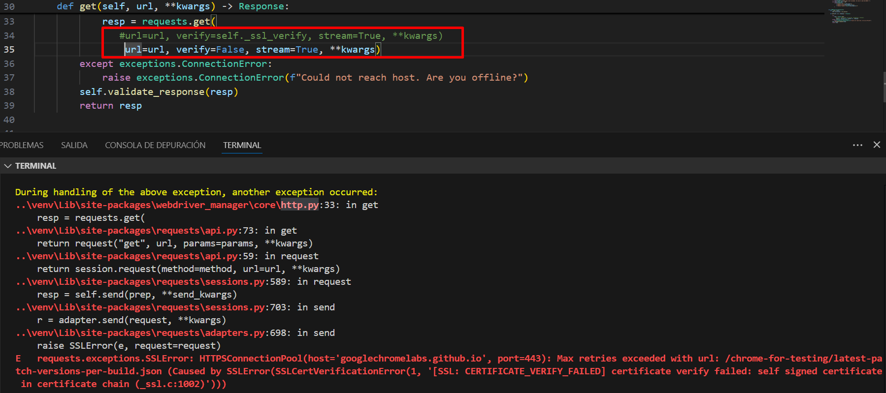 Si deseas que webdriver-manager gestione automĂĄticamente las actualizaciones del driver de chrome y tu script va a ejecutarse en un entorno corporativo donde las conexiones a internet sales por medio de un proxy, debes editar el archivo .\Lib\site-packages\webdriver_manager\core\http.py segĂșn la imagen siguiente: